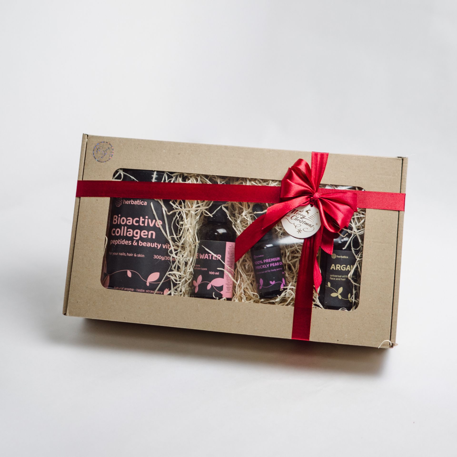 Ez a szett teljes szépségápolási rituálét kínál az arcbőr, a haj és a körmök számára. A bioaktív kollagén belülről támogatja a bőr feszességét, a hajnövekedést és az egészséges körmöket. Az argán- és kaktuszfügeolaj, valamint a rózsavíz intenzív hidratálást, táplálást és természetes ragyogást biztosít a bőrnek. Ideális ajándékként, valamint a mindennapi szépségápoláshoz tiszta, természetes formában.
